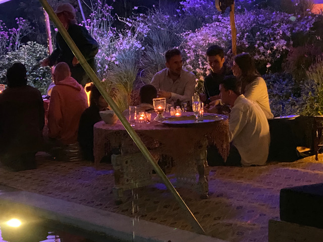 Geeft een warme bohemian sfeer. Lounge Zetel aangepaste tafels met prachtige handbeschildering en gouden of zilveren poufen.
